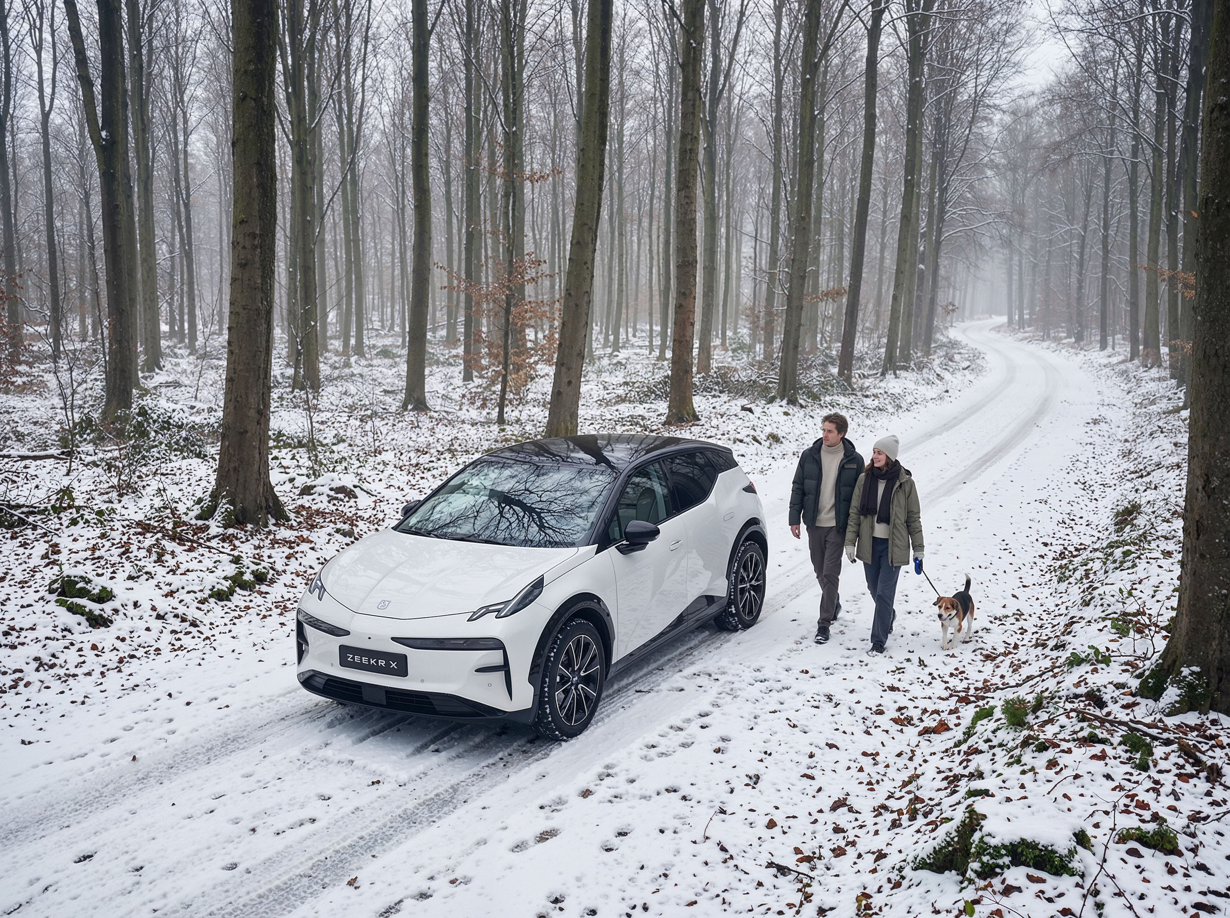 A Zeekr car, model X. North of Copenhagen. February. Snow.